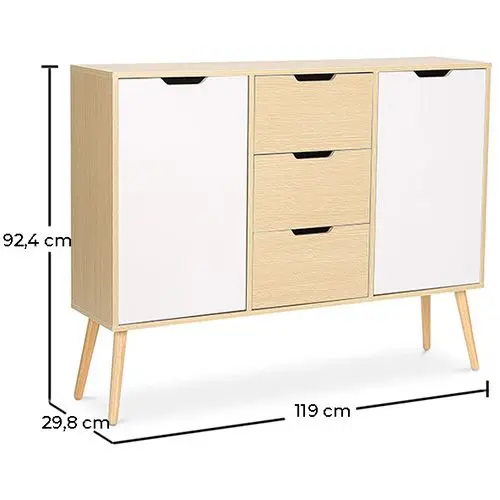 Ce magnifique buffet nordique est fait de bois de haute qualité et se compose de 3 grands tiroirs et de deux portes aux extrémités. Ce buffet en bois se distingue non seulement par sa grande capacité de rangement, mais également par son design élégant, qui associe le blanc au bois naturel.