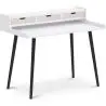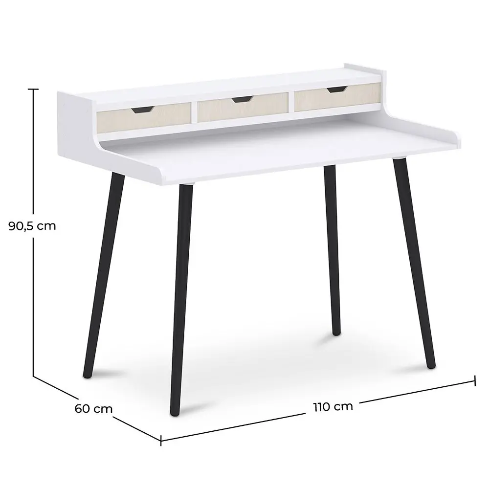 Ce bureau à domicile design comprend un plateau blanc à bords arrondis, un revêtement fiable et durable pour toute activité. Ce bureau en bois est idéal pour être place aussi bien dans une chambre ou utilisée comme table d'ordinateur. Avec ses trois petits compartiments qui offrent suffisamment de place pour le rangement, ce bureau scandinave possède un design élégant avec un support ergonomique intégré. Les pieds en bois sont solides et robustes et offrent une résistance optimale, quel que soit l'usage auquel il est destiné. Ce bureau design mettra en valeur la plupart des pièces de votre maison et donnera une impression à la fois traditionnelle et moderne.