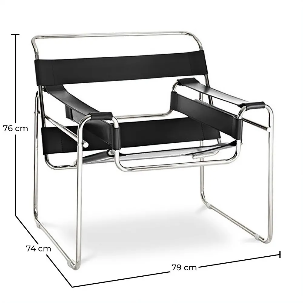 Originale et innovante cette chaise mêle à la fois luxe et sobriété. Les tubes en acier inoxydable représentent le "minimum": la célèbre signature du designer. L'assise en cuir premium de qualité du fauteuil est légèrement inclinée afin pouvoir se relaxer tout en confort. Grâce à son design simple et épuré ce fauteuil s’adaptera à n’importe quelle pièce de votre intérieur. Elle convient parfaitement à un environnement professionnel.