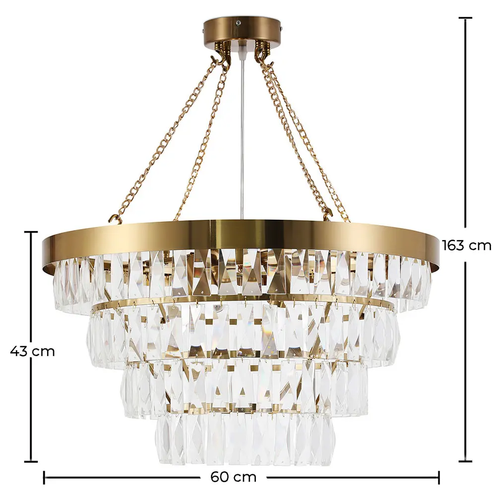 Ce chandelier Ania offre une esthétique qui suscite l'admiration de tous. Avec sa chaîne de suspension de 120 cm, vous pourrez la suspendre aussi bien au salon qu'au-dessus d'une table à manger. Ce chandelier est un luxe vintage en métal doré et cristal. Un choix idéal pour les propriétés résidentielles et commerciales.