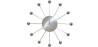 Douze petites boules argentées comme des satellites gravitant autour d’un grand cercle central, sur lequel sont accrochées les aiguilles de cette horloge murale. Le métal reflète la lumière. En plus de vous donner l’heure, il s’agit d’un véritable objet de décoration pour égayer votre salon, cuisine ou chambre à coucher.