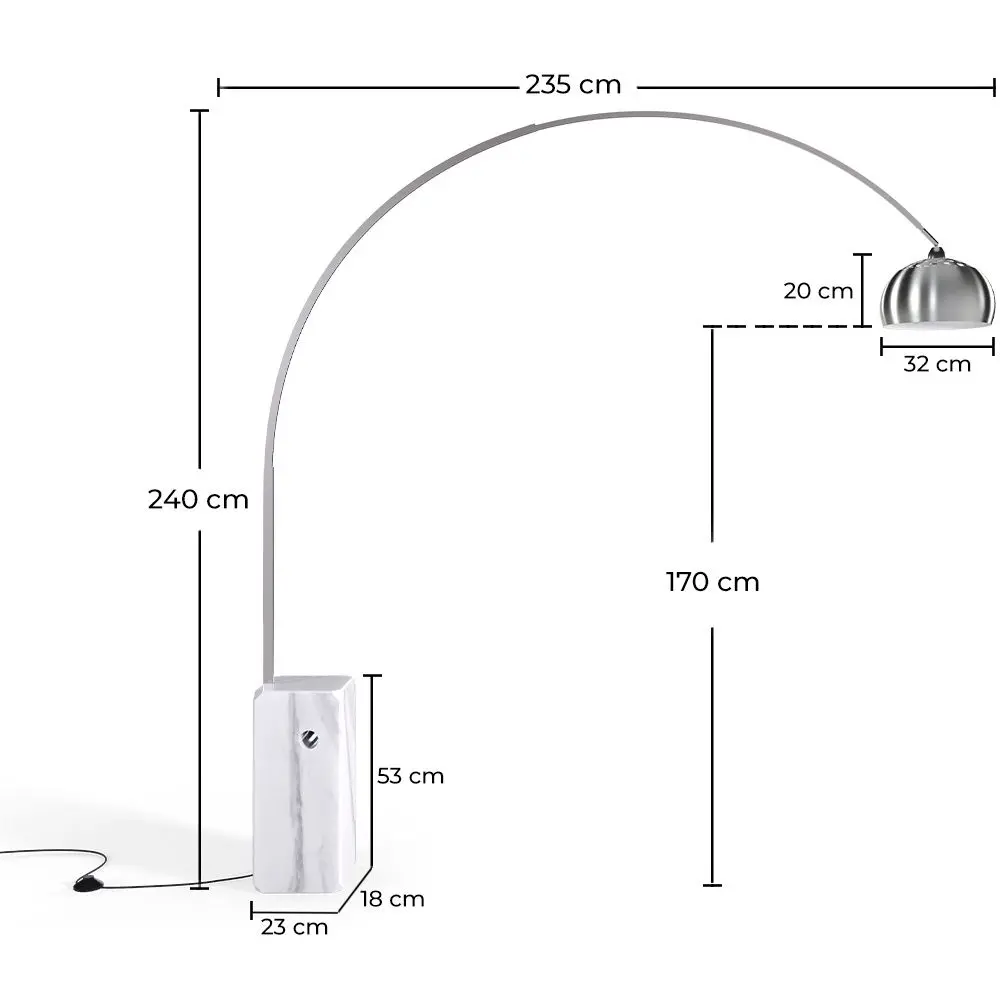 Lampe en marbre style Arc. La Lampe Arc est un chef-d'œuvre. Cette lampe de design largement reconnue fut une icône des années 60 et demeure moderne tout en étant élégante. Cette lampe simple et raffinée accentuera le côté contemporain de votre décoration tout en fournissant un éclairage parfait pour votre salon ou votre salle à manger. Elle est aussi pratique que légère. La Lampe Arc est un véritable succès de vente dans le monde de l'éclairage; vous ne regretterez pas votre dernière acquisition. Elle est disponible en noir et blanc.