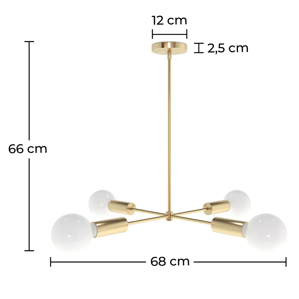 Ce chandelier est idéal pour compléter les décorations modernes. Dotée d'une base en laiton et de 4 fentes pour des ampoules allant jusqu'à 60W, cette lampe suspendue est capable d’offrir un éclairage optimal dans toutes les directions. Ses ampoules nues, combinées à la couleur dorée du laiton, lui confèrent un aspect à mi-chemin entre vintage et moderne qui ne laissera personne indifférent.