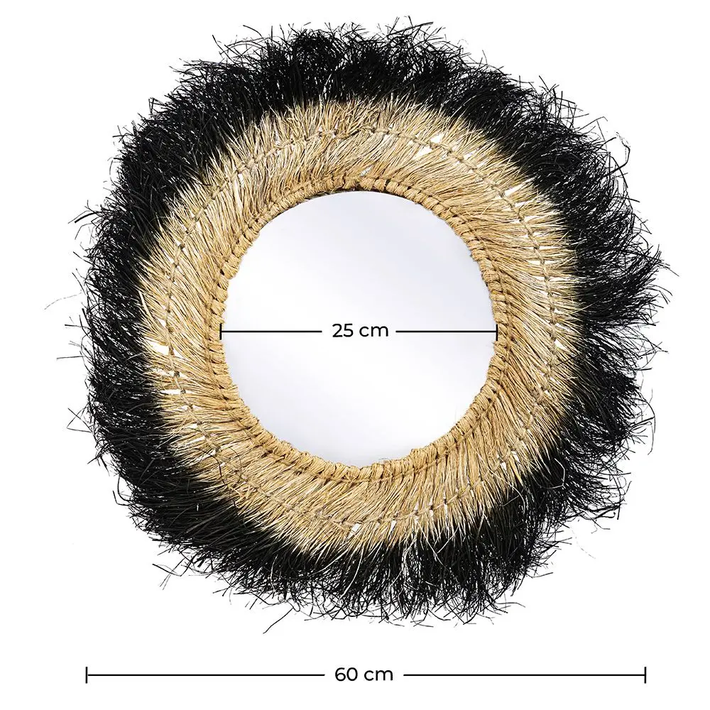 Rien de plus apaisant qu’une touche de nature dans votre décoration intérieure. Ce miroir mural rond boho est une véritable bouffée d’air frais capable d'ensoleiller votre intérieur en un clin d'œil. Fabriqué à partir d’herbes marines naturelles tissées à la main, il tire sa force de sa forme atypique et de la splendide dualité de couleur entre l’herbes naturelles et l’herbe peinte en noir pour un effet saisissant.