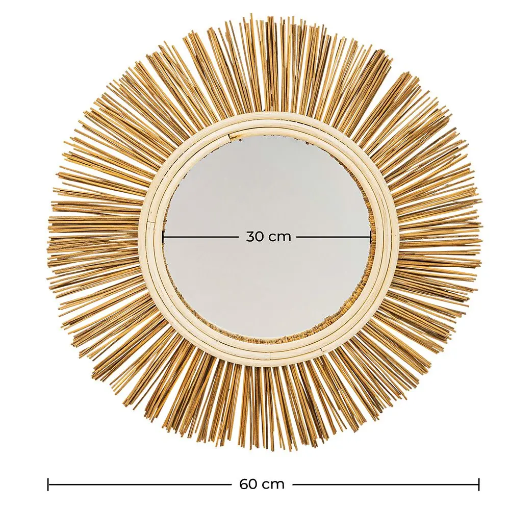 Laissez la nature envahir votre intérieur avec ce splendide miroir mural rond boho en rotin. Sa forme atypique en soleil apportera une ambiance apaisante et chaleureuse à votre décoration et fera la joie des amateurs du style Boho chic. Fabriqué à partir de rotin 100% naturel et tissé à la main avec soin par de véritable artisans, ce miroir mural rond n’est pas seulement pratique, c’est aussi un véritable objet de décoration.
