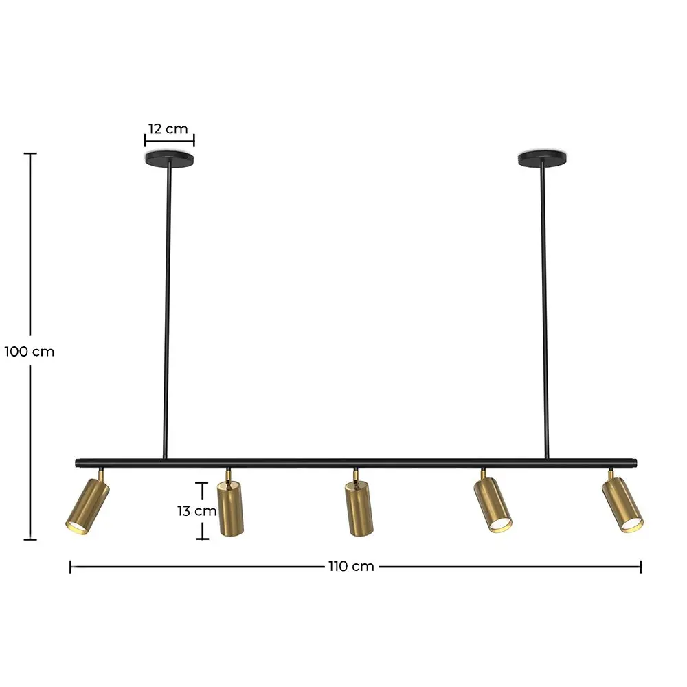 Le spot sur rail Lark avec ses 5 spots dorés orientables est un luminaire design premium, idéal pour les hôtels, les restaurants et les cafés. Ce spot sur rail suspendu moderne de style industriel mesure 110 centimètres de long. Ses spots orientables vous permettent d'ajuster la position de la lumière pour créer l'ambiance parfaite dans la pièce que vous souhaitez.