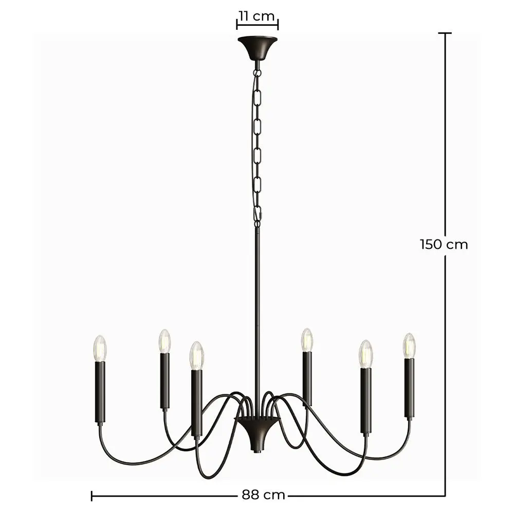 Apportez une touche élégante et contemporaine à n'importe quel espace avec cette suspension en métal noir mat, inspirée du design classique des chandeliers. Dotée de six bras incurvés, cette lampe combine l’esthétique traditionnelle à une allure moderne et minimaliste, idéale pour les salles à manger, salons, entrées ou espaces à plafond haut.