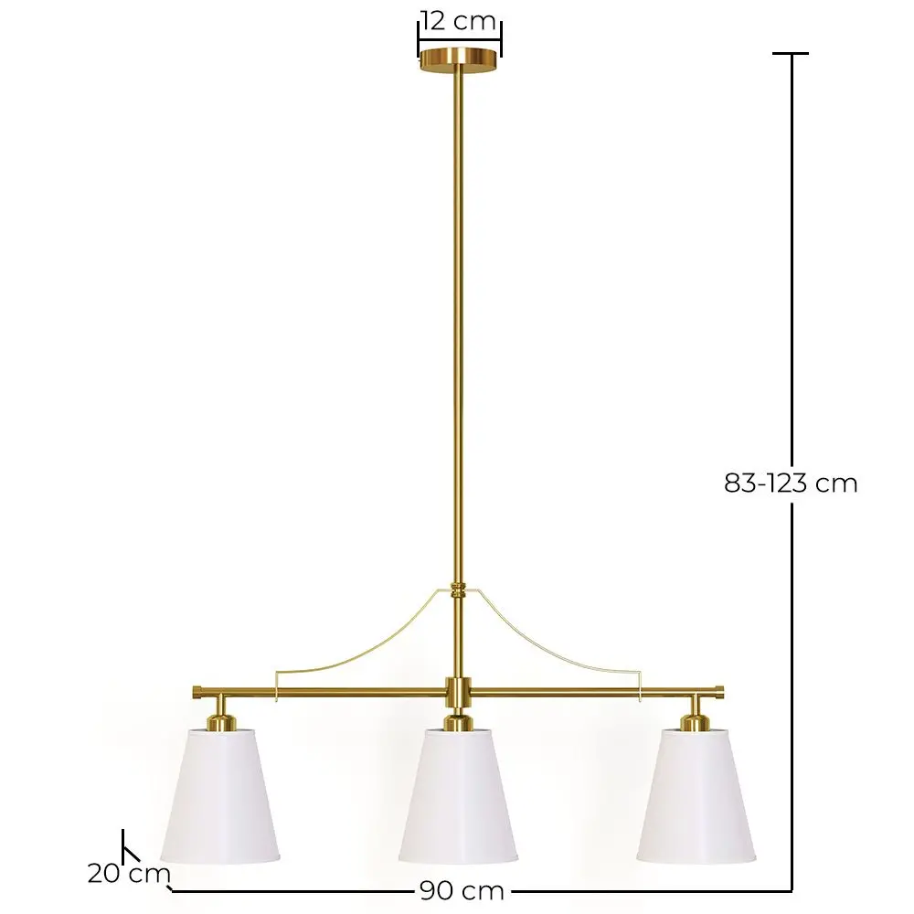 Apportez une touche d'élégance et de chaleur à votre maison avec cette suspension plafonnier en métal doré vieilli, une pièce sophistiquée qui associe design classique et fonctionnalité moderne. Sa structure linéaire supporte trois abat-jours en tissu blanc, diffusant doucement la lumière pour créer une ambiance chaleureuse et accueillante, idéale pour la salle à manger, le salon ou la cuisine.