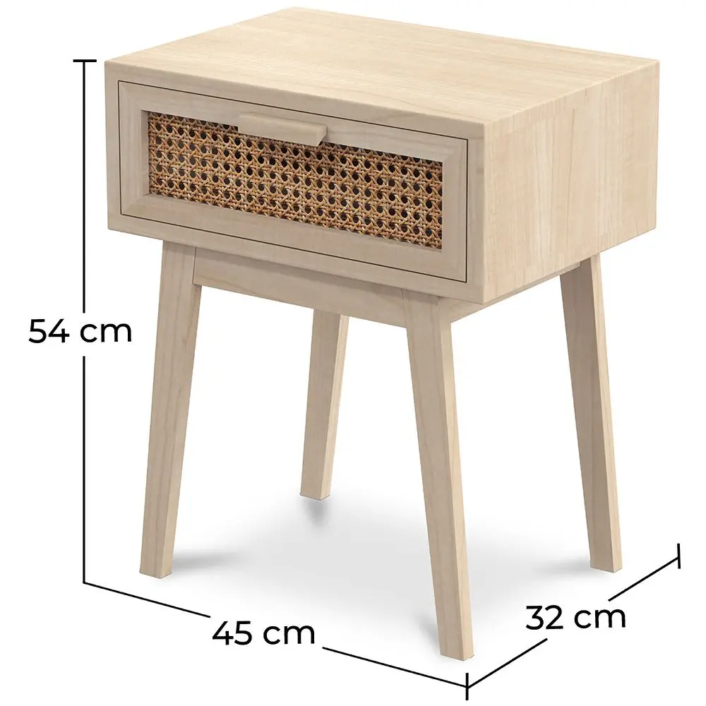 Cette table de chevet design est idéale pour les chambres à coucher à la maison ou dans les hôtels. Gardez vos effets personnels à portée de main, comme la télécommande de la télévision, un Kindle ou votre téléphone portable grâce à l'espace de rangement offert par le tiroir à façade en cannage, qui s'ouvre et se referme en douceur grâce aux charnières de qualité supérieure . Le cannage en rotin et la couleur naturelle du bois de cette table de nuit se combinent parfaitement à tous les styles de décoration. Le design en cannage est typique du style boho chic et donnera à votre chambre à coucher une touche unique.