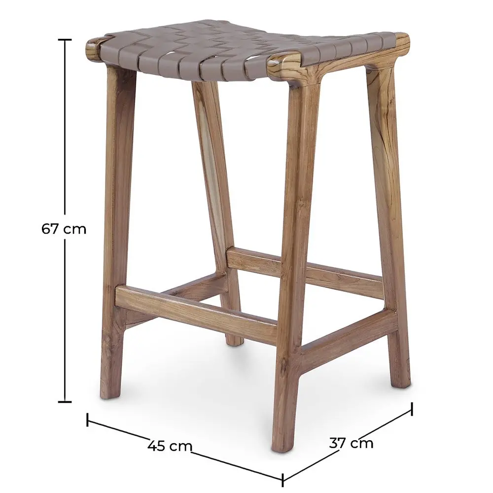 Simple mais efficace, tant pour son design que sa conception. Ce tabouret de bar en teck ira à ravir à votre bar en intérieur ou votre îlot de cuisine. Son revêtement en cuir tressé lui donne un look intemporel et élégant, tout en le rendant confortable à souhait. Avec ses dimensions de 47x37x67 centimètres, ce tabouret de bar en teck et cuir tressé convient à la plupart des morphologies.