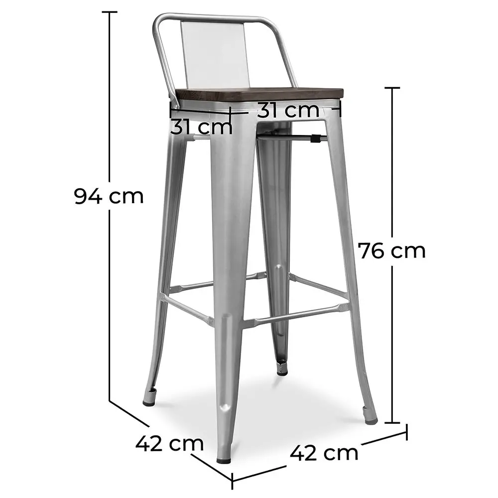 Profitez du mélange parfait de confort et de style avec le tabouret Metalix doté d'un dossier et d'une assise en bois naturel foncé. Avec une hauteur d'assise de 76 cm du sol, il est idéal pour les bars hauts, les îlots de cuisine ou les espaces d'accueil recherchant un look industriel authentique et sophistiqué.